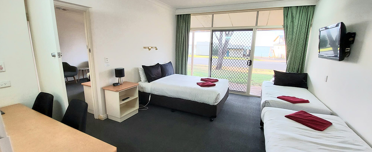 Same as the Deluxe room above, but with door in between, has a queen and 2 singles in one room and a queen and 1 single in the other.